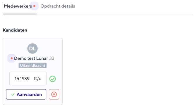 Aan het flikkerende bolletje voor een opdracht, kun je zien of een medewerker zich kandidaat heeft gesteld voor de opdracht en dus kan werken. Wanneer je dan op de opdracht klikt, zie je over welke medewerker het gaat.