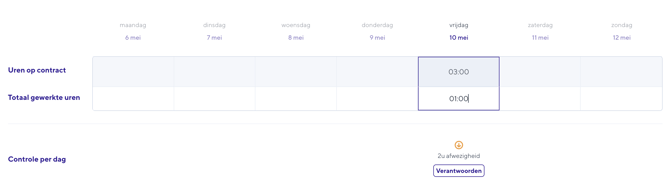 Je zult merken dat je een verantwoording moet afleggen wanneer je minder uren doorgeeft dan op het contract staan. Hoe doe je dit? Je klikt op de knop "Verantwoorden" en kiest vervolgens een vakantie. Daarna dien je nogmaals het aantal afwezige uren (in dit geval de contracturen) in te geven in het kader.
